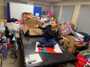 “For many of these individuals, these are the first gifts they have ever received,” said SHELTER, Inc. Volunteer Coordinator Yareth Rodriguez, pictured at right amidst just a fraction of the small mountain of donations. “We thank you for your support and generosity. None of this would be possible without your help.”
