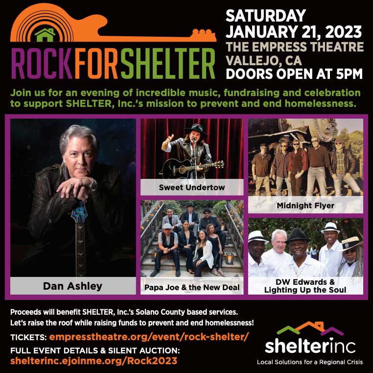A 5-band fundraising concert with proceeds benefitting SHELTER, Inc’s Solano County-based services to prevent and end homelessness.